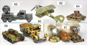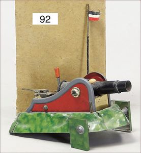 3 Teile Blech, 2 Scheinwerfer, 12 cm hoch, kleiner Tank, Blech lithogr., Uhrwerk intakt, mit sich hebendem Kanonenrohr, guter Zust., dazu ein Lineol-Orig.-Kart.