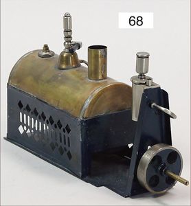 FLEISCHMANN Dampfmaschine, liegender Kessel, Grundplatte 37x42,5 cm, Kessel Messing poliert, Durchmesser 8 cm, Manometer, Wasserstandsglas, Pfeife mit Brenner, dazu 1 Stanze im Orig.-Kart., insges. guter Zust.