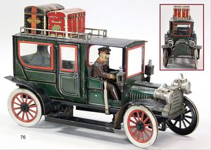 Karrett-Limousine, Blech, Limouse, 40 cm, lith., Fahrerfigur handlackiert, 2 Türen zum Öffnen, Türen farbl. überarbeitet, möglicherweise ergänzt, geschliffene eingesetzte Gläser, bespielt, mit 2 Koffern
