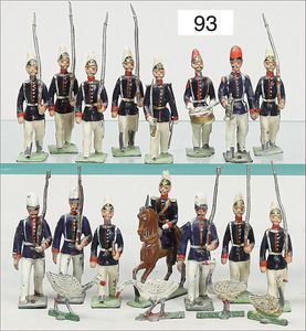 HEYDE 13 Teile Zinnfiguren, plastisch, 5 cm, u.a. marschierend, teils Musiker, teils Fahnenträger, 1 Reiter, Gänse, in kl. Holzkiste