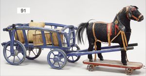 Zugpferd mit Leiterwagen, Holz, handlackiert, Pferd stoffbezogen, Gußspeichenräder, um 1900, 60 cm, schöner Orig.-Zust.