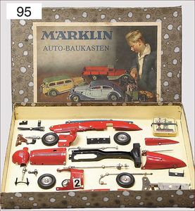 MÄRKLIN Baukastenauto, Stromlinienlimousine, Blech, Uhrwerk intakt, Lenkung ausgehängt, eine Tür farblich überarbeitet, bespielt, Lackfehler, Nummernschild fehlt