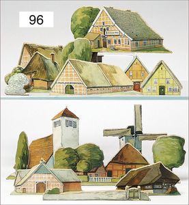 19 Teile Aufstellfiguren, Dorf, Holz, mit lithogr. Papier beklebt, Kirche, Häuser, Bäume und anderes, Höhe 2,5-11,5 cm