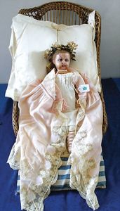 HEUBACH Vollkopf-Baby, gem. Nr. 7, Haarriss am Hinterkopf, blaue gemalte Augen, geschl. Mund, Masse-Sitzbabykörper, 16 cm, dazu kl. Wiege, stoffbezogen