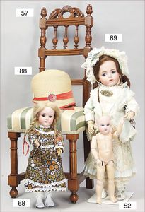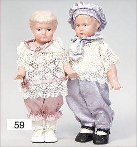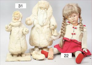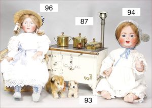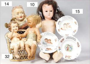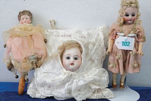Porzellan-Puppe, blaue Schlafaugen, off. Mund, Zähne, Kopf gerissen, an einigen Stellen geklebt, auf Masse-Stehkörper, mit anmodellierten Schuhen u. Strümpfen, rechter Fuß geklebt, 18 cm, Mohairperücke aufgeklebt, dazu Porzellankopf, modellierte Frisur, gemalte Augen, auf Holzgriff aufgeklebt, Stoff überzogen, 18 cm, (keine Funktion), Porzellan-Puppengesicht, mit fest eingesetzten Glasaugen, Mohair aufgeklebt, auf kl. Kissen, ca. 14 cm x 14 cm
