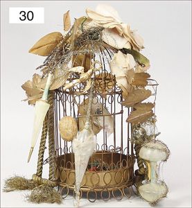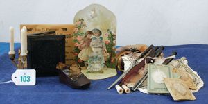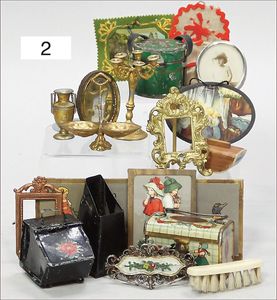 Konv. Puppenstuben-Zubehör, 2 x Kohlenschütte, kl. Botanisiertrommel, altersbed. Lackabplatzer, Höhe 4 cm, einige Wandbilder, kl. Blechkoffer, Zinn-Kerzenständer, Vase, Gebäckschale, Bilderrahmen, u. anderes