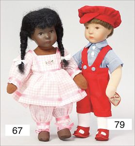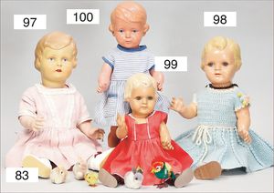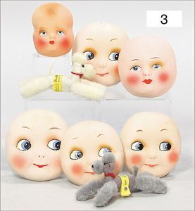 6 Puppenmasken, Papiermaché, Stoff überzogen, gemalte Augen, Typ Googly, dazu 2 Steiff Pudel, mit Fahne, Nr. 1505 u. 1506