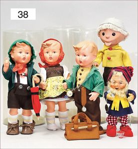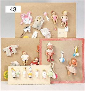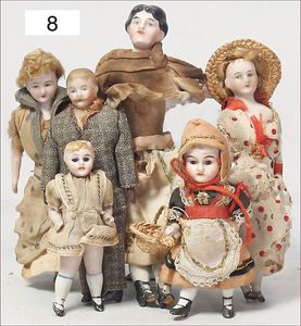 6 Puppenstuben-Puppen, Porzellan, 4 x Stoffkörper, Porzellan-Arme u. Unterschenkel, mit anmodellierten Schuhen u. Strümpfen, 1 x Mann mit Bart, 12 cm, 3 Damen, 13 cm - 16 cm, 2 Kinder, Ganzbiskuit, 1 x Perücke fehlt, 9 cm u. 10 cm