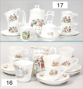 Konv. Porzellangeschirr, 6 Kaffeetassen mit Untertassen, mit Motiv Putten, 1 Krug mit Weihnachtsmotiv, 1 Kaffeetasse mit Porzellaneinsatz für Bartträger, kl. Abplatzer am Rand