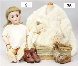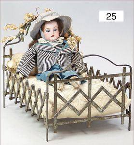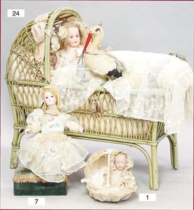 Porzellan-Brustblattkopf-Puppe, Brustblatt an mehreren Stellen geklebt, blaue fest eingesetzte Glasaugen, off. Mund, Zähne, Kunsthaarperücke aufgeklebt, Stoffkörper, Porzellan-Arme, 1 Arm geklebt, Masse-Unterschenkel, Wachs überzogen, 37 cm, dazu Korbbett, 53 cm, mit Bettzeug, Wattestorch