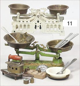 2 Küchenwaagen, 1 x Guss, ca. 15 cm, 1 x Metall, beige lackiert, 14 cm, dazu 1 Bügeleisen mit Ablage, u. anderes
