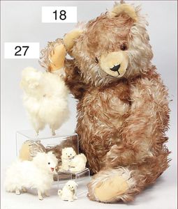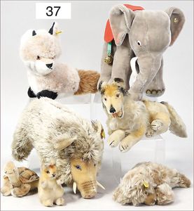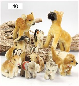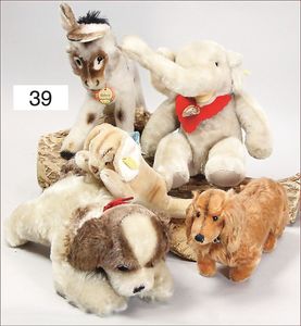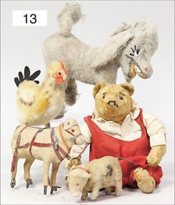 STEIFF Henne, mit Knopf u. Fahne, Nr. 3370/16, 1 Esel, stark bespielt, kl. Bär, Füllung zusammengerutscht, stärker bespielt, Tatzen an kl. Stellen aufgegangen, Hersteller?, 23 cm, 2 Papiermaché-Kühe
