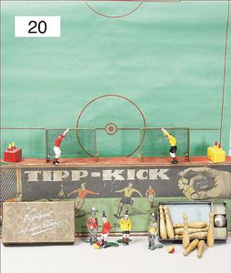 Tipp-Kick Spiel, mit Torwart Toni, bespielt, altersbed. Farbabplatzer, sonst komplett, Deckel etwas eingerissen, dazu 1 Tisch-Kegelspiel, Holzkegel, 9 cm, mit Stahlkugel u. Anleitungen