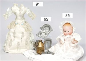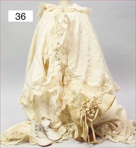 2 teile Kinderkleidung, 1 x altes Taufkleid, 1 x Baumwoll-Sommerkleid, dazu 1 Hermelinkragen, kl. Puppenmantel mit Haube, Samt, fellbesetzt, für ca. 38 cm - 40 cm Puppe, 1 Puppendeckelkorb