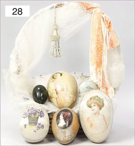 alter Osterpräsentkorb, mit 6 Ostereiern (Candy Container), 3 x stoffbezogen, 2 x mit Papier beklebt, zw. 8 cm u. 19 cm