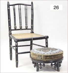 Kinderstuhl, Holz, Wiener Geflecht, Sitzhöhe 28 cm, dazu 1 Fußhocker, Holz, mit Perlenstickerei, Höhe 17 cm