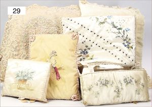 6 Seiden- bzw. Samtkissen, wohl für Taschentücher, u. anderes, alt, teilw. mit filigraner Perlenstickerei u. Spitze, zw. 25 cm u. 58 cm