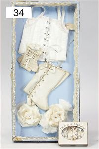 Pappkarton mit Glasdeckel, darin Puppenmieder, Gamaschen, fingerlose Handschuhe, 2 Stoffblumen, dazu kl. Box mit 6 Strumpfbänder, Aufschrift "Unserem Liebling"