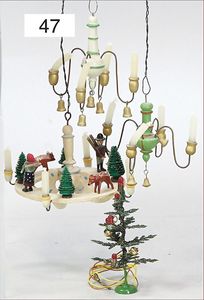 3 Puppenstuben-Deckenleuchter, Holz, 3 x weihnachtlich, dazu 1 Tannenbaum, Alter?, Metall Höhe ca. 10 cm
