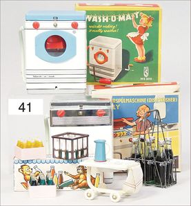 3 Teile Küchenzubehör von MS, Geschirrspülmaschine von Dolly, Wasch-O-Mat, sehr guter Zust., im Orig.-Kart., dazu 1 Waschtisch, aufklappbar, Celluloid, Getränkesortiment für den Kinderkaufladen, im Orig.-Kart., 1 x Flaschenträger mit 6 Cola-Flaschen