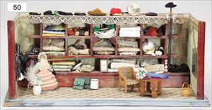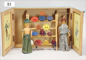 "Der kleine Modesalon", Modeladen, Holz, zum Aufklappen, 37 cm x 26 cm x 8 cm, von Wilde und Spieth Esslingen, rechte Tür lose