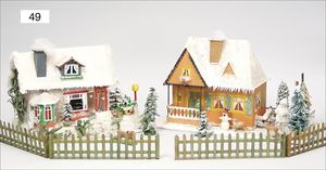 2 Weihnachtshäuser, mit elektr. Anschluss, Tannenbäume u. einige Massetier im Vorgarten, Länge 36/39 cm