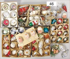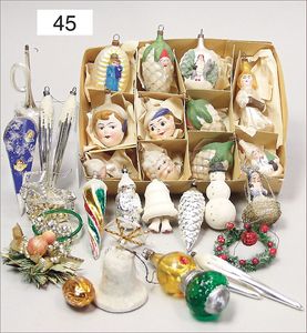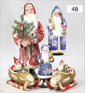 5 Teile Weihnachtsdekoration, Nikoläuse, Alter?, Papiermaché, 2 Schlitten, Länge ca. 22 cm, 1 x Nikolaus, blau bemalt, 23 cm u. 30 cm, 1 x Nikolaus mit Weihnachtsbaum, stoffbezogen, Höhe 45 cm