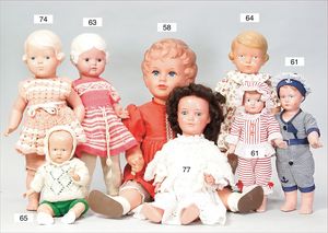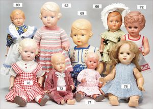SCHILDKRÖT Bebi, 1925, Celluloid, gem. 30, blaue gemalte Augen, Sitzbabykörper, mit untersch. Handhaltung