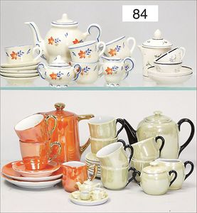 Konv. Kinderporzellan, 1 x 60er Jahre Tee- u. Kaffeekanne, 2-farbig, 1 x orange/gold, 1 x gelb/schwarz, dazu 2 x Kinderkaffeeservice, cremefarben, 5 Tassen, Zuckerdose, Teller, Milchkännchen, Kaffeekanne, 3 cm - 9 cm, blaue florale Bemalung, 1 x Service, Kaffeekanne, 2 Tassen, 1 Henkel fehlt, 3 Teller, schönes Konv.