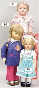 KÄTHE KRUSE Mädchen, Hinterkopfnaht, Echthaarperücke, Farbabplatzer bzw. ausgebesserte Stellen im Gesicht, Stoffkörper, abgenähte Kniekehlen, etwas angeschmutzt, kl. Stelle am Oberschenkel aufgegangen, 48 cm