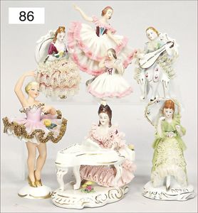 7 Porzellanfiguren, einige gem. Alka Dresden, tanzend u. musizierend, zw .6 cm u. 16 cm, Spitzen teilw. Porzellan bzw. Stoff gestärkt