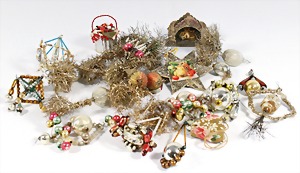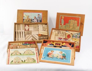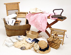 Puppen-Zubehör für den großen Waschtag, Bügeleisen, Waschbrett, Mangel, 4 Porzellan-Seifenschalen mit Deckel, kl. Ecke weggebrochen, Bügeleisen, einige Kleidungsstücke, 1 kleinere - mittlere Puppe, 4 Babyhauben, Baumwolle mit Spitze, kleiner Deckelkorb, Silberrassel, kleines Körbchen mit Celluloid-Baby
