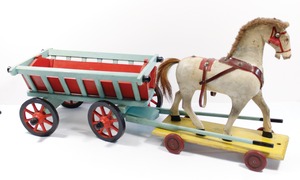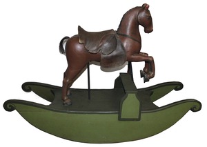 Kinderschaukelpferd, Holz, frühes 19. Jhd., linkes Bein geklebt, mit Ledersattel, Sitzhöhe 80 cm, Bemalung später