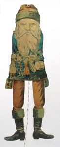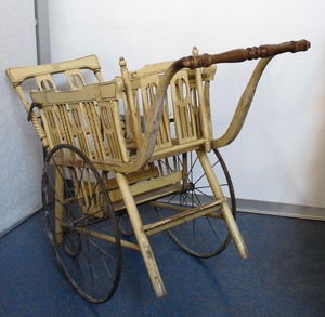 alter Holzschlitten, Metallkufen, Griffhöhe 85 cm, dazu 1 Nikolaus, Stoff, weich gestopft, Filzgesicht, Handarbeit der Künstlerin Thea Graf, ca. 100 cm