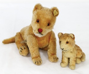2 Löwe, Kunstplüsch, 1x mit Knopf u. Fahne, Nr. 5316, mit Druckstimme, Stehhöhe 16 cm, 1x sitzend, Höhe 10 cm