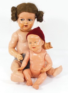 Celluloid-Puppe, gem. 1728/8, für Schildkröt, braune Schlemenaugen, off. Mund, 2 Zähne oben, Echthaarperücke fest aufgeklebt, Celluloid-Stehbabykörper, mit leicht abstehendem Zeh, 48 cm, dazu Schildkröt, Baby, gem. SiR 32, blaue gemalte Augen, Celluloid-Sitzbabykörper mit untersch. Handhaltung