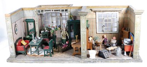 2-tlg. Puppenstube mit Erker, wohl Gottschalk, 83 x 40 x 31 cm, mit einigen Teilen Puppenstuben-Mobiliar, Wohnzimmer, 2-türiger Schrank, verglast, 20 cm, mit Couch, Tisch, 2 Stühle, Spiegeltisch, kl. Porzellan-Brustblattkopf-Puppe, kl. Küche mit Blechherd, einige Celluloid-Püppchen, mit einigen Teilen Zubehör