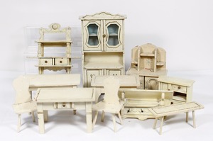 Puppenstuben-Möbelprogramm, Holz, Wohnzimmer, Schrank, Höhe 22 cm, Kommode, Spiegel, Couch mit Überbau, Tisch u. 3 Stühle