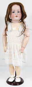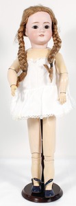 Porzellan-Charakterpuppe, gem. 5365, blaue nachtr. eingesetzte Schlafaugen, off./geschl. Mund, Echthaarperücke, auf Masse-Gliederköper, Arme nachtr. ergänzt, Kopf u. Körper nicht zueinander passend, 43