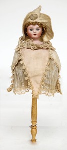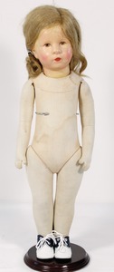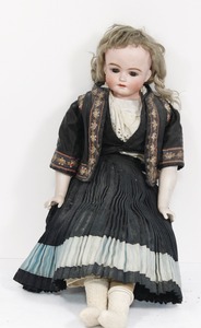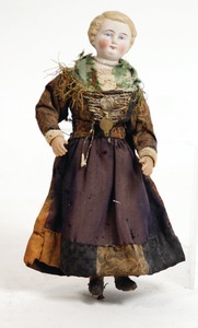 Puppe, deutl. sichtbare Hinterkopfnaht, Perücke fehlt, starke Krakellee-Bildung, an Augen, Mund u. Wangen übermalt, auf Stoffkörper mit breiter Hüfte, einige Mottenlöcher an den Händen, 42 cm