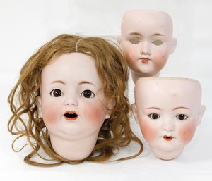 3 Porzellan-Puppenköpfe, Simon & Halbig, Nr. 166/10, braune Schelmenaugen, off. Mund, 2 Zähne Oben, Zunge, Altbeck u. Gottschalk, gem. 1361/45, braune Schlafaugen, Nasenlöcher, Zähne fehlen, Hertel, Schwab & Co., gem. Germany 98/11, blaue Schlafaugen, Augenmechanismus lose, off. Mund, 2 Zähne oben, Nasenlöcher