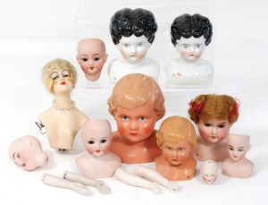 Konv. Puppen-Brustblattköpfe, Porzellan u. 2x Celluloid, AM gem. 8, mit braunen Schlafaugen, fest aufgeklebter Perücke, 1x Schoenau & Hoffmeister, gem. 4700, braune fest eingesetzte Glasaugen, off. Mund, Zähne, 1x Simon & Halbig, 10, 2 glasierte Brustblattköpfe, schwarz modellierte Frisur, 2 Köpfe gem. Halbig 1079, 192, Damenkopf, Wachs überzogen, seitl. geneigt, mit Mohairperücke, gemalte Augen, 2x Minerva, Nr. 2 u. Nr. 6