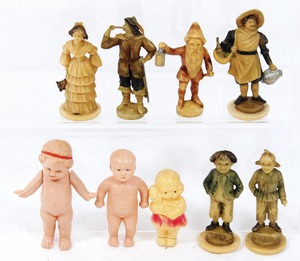 Konv. 9 Celluloid-Figuren, 6x auf Fuß montiert, u.a. Max u. Moritz, 1 Wirt, 1 Dame, Zwerg mit Laterne, 1 Edelmann, Hut an 2 Stellen weggebrochen, kl. Celluloid-Figuren von Schildkröt, Figuren ca. 6,5 cm, 2x Minerva, gem. 6 ½ u. 8