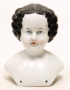 Porzellan-Brustblattkopf, schwarz modellierte Frisur, blaue gemalte Augen, Haarriss am Brustblatt hinten, Höhe 17 cm