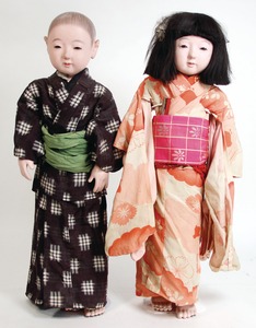 Puppenpaar, asiatisch, Muschelkalk, braune fest eingesetzte Glasaugen, geschl. Mund, Echthaarperücke, auf Stoff/Papierkörper, Mädchen mit Stimme, Masse-Arme und -Unterschenkel, 2 Fußsohlen fehlen, 1 lose, ca. 75 cm, im Kimono