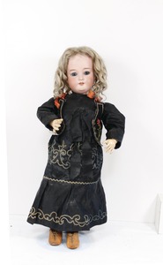 Porzellankopf-Puppe, gem. 390 A 11 M, blaue Schlafaugen, off. Mund, Zähne Mohairperücke, auf Masse-Gliederkörper, mit Kugelgelenken, 64 cm, alte Kleidung u. Lederschuhe