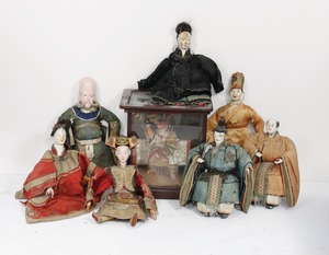 Konv. asiatische Puppen (Kaiserliche Hofstaat), teils Holz geschnitzt / Muschelkalk, versch. Gr., 1 Figur in Glasvitrine, Höhe 23 cm