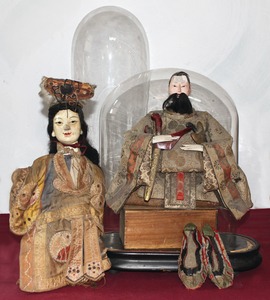 2 asiatische Figuren, 1x Krieger, Masse/Muschelkalk überzogen, gr. Ausbruch an der Stirn, Glasaugen, Holzhände, Holz geschnitzte Waffen, alte Kleidung, 27 cm, unter Glassturz, dazu asiatische Figur, Holz geschnitzt, alte Kleidung, 33 cm, 1 Paar japanische Kinderschuhe, Stoff, 13 cm