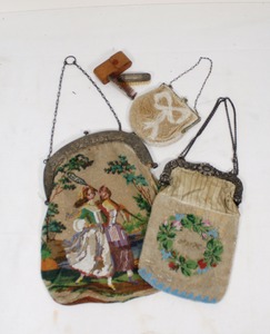 3 alte Perlentaschen, 11,5 cm, 22 cm, u. 28 cm, 1 Beutel stellenw. eingerissen, mit kl. Löcher, dazu 1 Puppen-Frisierset, in Schatulle, Bürste u. Kamm