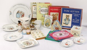 Kindergeschirr, Porzellan, beige mit Goldrand, teils etwas abgegriffen, 2 Suppenterinen, Durchm. 10,5 cm, Platte, Soucier, 2 Schüsseln, 6 Tiefe u. 4 flachs Teller